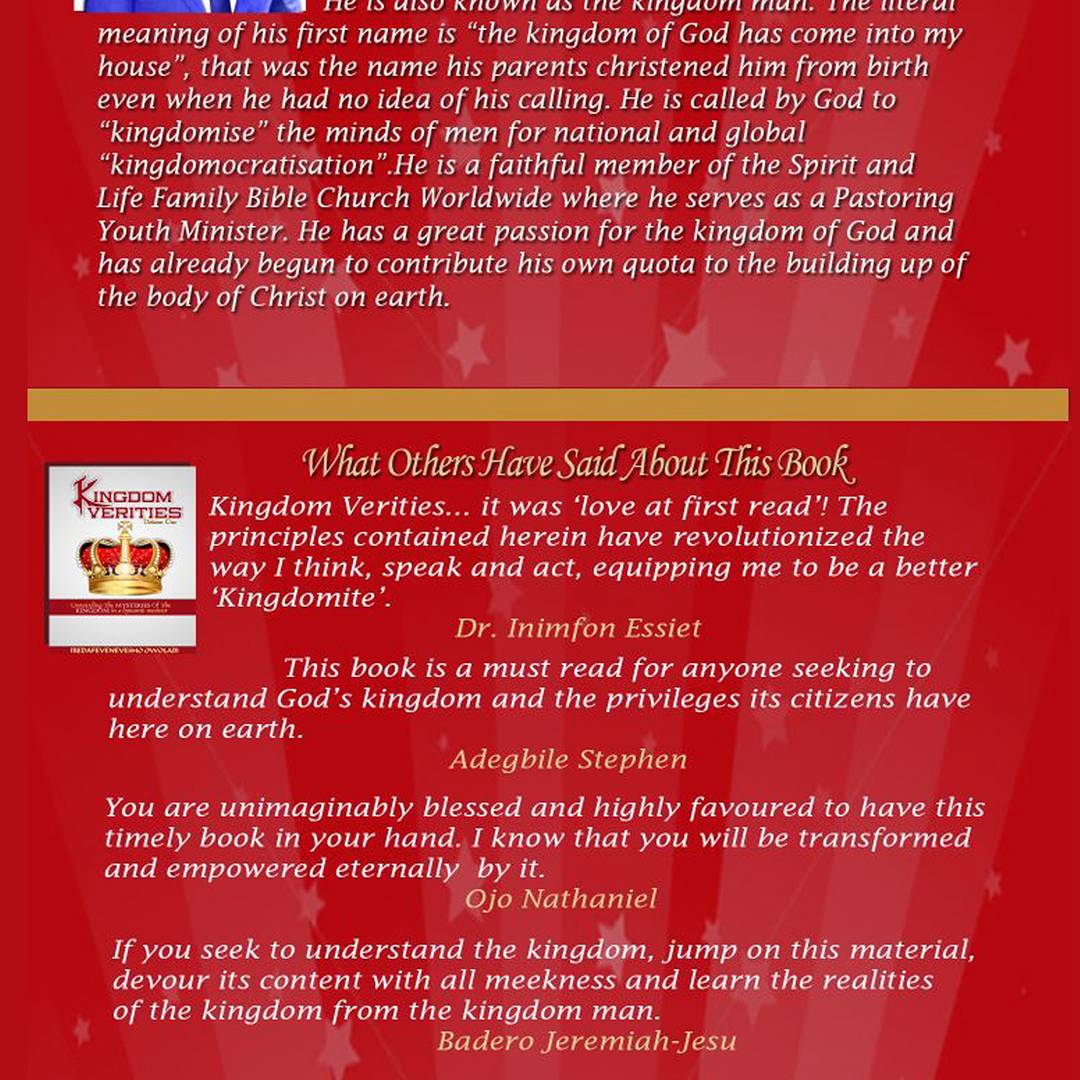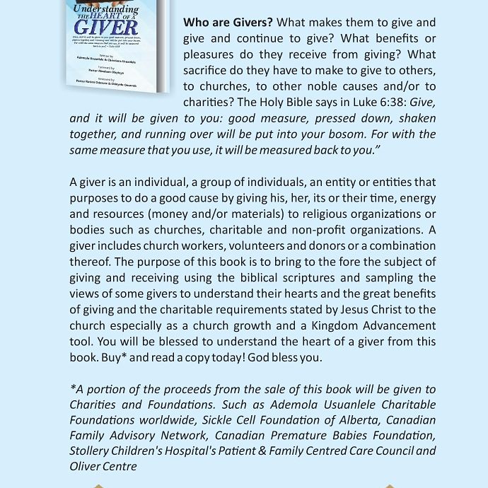Ademola Usuanlele was the International Liaison of The Virtuous Woman Magazine, was an Assistant Director of Training in Spirit and Life Family Bible Church and Godhead Prayer Ministry. Ademola was a coordinator and Pastoring Disciple in Spirit and Life Family Bible Church and Godhead Prayer Ministry both in Edmonton, Alberta Canada. He was a New Man in Christ. He was an alternate cell group minister, was an altar steward and was an usher in Winners Chapel International in Edmonton, Alberta Canada. He is a former member of Gideon International. He enjoys Kingdom Advancement Prayers, singing, praising and serving Jesus Christ our Lord. He also enjoys traveling, working on complex projects, music, reading, mentoring and learning new languages. Ademola is married to Christiana "Titilayo", he has a daughter Pauline and a son Ademola Jnr. He is a past board director of Oliver Centre in Edmonton, Alberta and a former board national treasurer and member Canadian Family Advisory Network (CFAN). He was a co-chair for the Edmonton, Alberta Canada Stollery Children's Hospital's Patient & Family-Centred Care Council (PFCCC). He is a former section Audit Chair of Edmonton Section of American Society for Quality (ASQ). He is the founder and board President of The Pink Shield Charitable Foundation. Ademola Usuanlele was board director of both Canadian Council for Africa (CCAfrica) and Canada-Nigeria Chamber of Commerce. He is a prolific writer, poet, songwriter and author of many published books and songs. He bears his God-given name of Peace Maker now as a High Representative of Jesus Christ. He is the first after Jesus Christ to be a Diamond-Studded Golden Eagle. By special grace and favour of God, he is trained in the "arts of the forbidden moves" if necessary or required. ... read more
